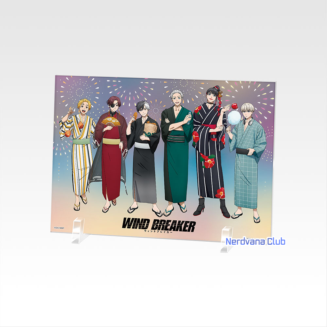 Este acrílico captura a los protagonistas de WIND BREAKER disfrutando de un festival japonés, todos vistiendo elegantes yukatas y rodeados de fuegos artificiales que iluminan la noche. Cada personaje sostiene un elemento típico de las festividades, desde ramune y dulces hasta abanicos y manzanas acarameladas, transmitiendo una atmósfera cálida y festiva.